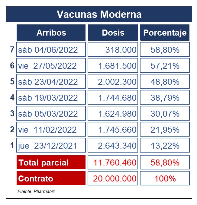 De esta manera, el total de dosis by Moderna recepcionadas por contrato asciende a 11.7 millones, lo que representa el 58,80% de lo pactado. A estas se suman 3.5 millones de unidades de la compañía, las que habían sido descargadas en julio pasado vía donación del Gobierno estadounidense, encabezado por Joe Biden. Ver donación.