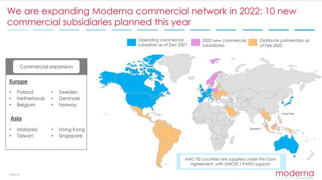 En una nota a los inversores, la compañía explicó que la facturación aumentó “principalmente por las ventas de la vacuna contra el COVID-19”, basada en la innovadora tecnología de ARNm. Durante 2021, las entregas de su blockbuster Spikevax sumaron 807 millones de dosis. Ver Presentación.