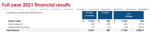 La pandemia de coronavirus dejó algunos ganadores bien marcados en el mundo de Farma. Y la biotecnológica estadunidense Moderna fue claramente uno de ellos. Sus ingresos se dispararon un 2.200% durante 2021 al totalizar u$s 18.471 millones, en comparación con los u$s 803 millones de 2020. Ver Press Release.