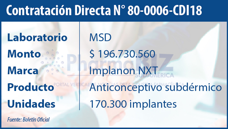 El Estado adjudicó una Contratación Directa por Exclusividad a la norteamericana MSD. Fue para adquirir más de 170 mil unidades de su anticonceptivo subdérmico Implanon NXT por $196.7 millones (u$s 8 millones).