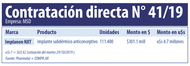 La multi recibirá por parte de la Secretaría de Salud de la Nación un total de $301.1 millones (u$s 4.7 millones) por 111.4 mil unidades de la marca Implanon NXT, a base de etonogestrel. Ver Artículo.