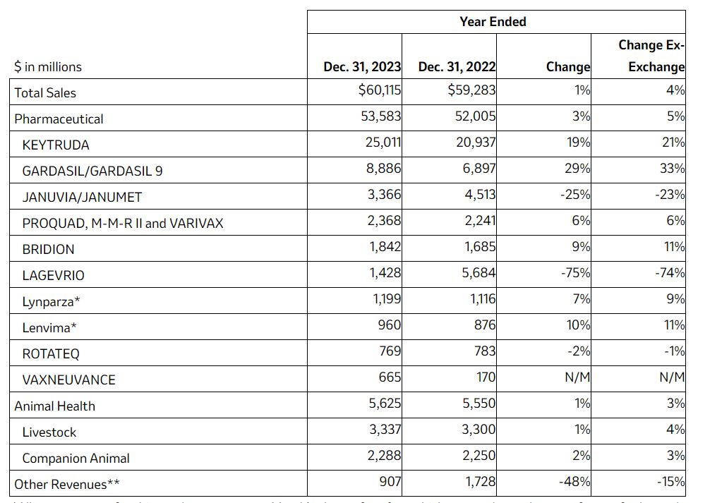 MSD dio a conocer sus resultados financieros correspondientes al 2023. Según el reporte, la compañía registró ventas por u$s 60.115 millones, cifra que representa un ligero incremento del 1% año contra año y un 4% sin considerar los tipos de cambio. Ver Press Release