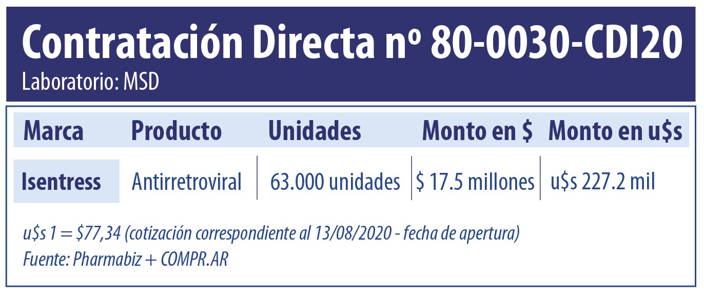 En abril de este año, la multi resultó adjudicataria de otra contratación relativa a Isentress. En ese momento, el Ministerio de Salud de la Nación se hizo de 3 millones de unidades del medicamento de MSD por una suma de $707 millones (u$s 10.3 millones*). Ver artículo Estado compra antirretroviral