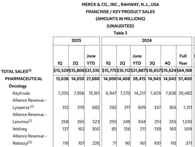 El laboratorio estadounidense MSD reportó ingresos por u$s 31.335 millones durante los primeros seis meses de su año fiscal 2025. La cifra representa un descenso del -2% en relación a igual período de 2024.