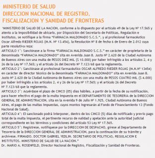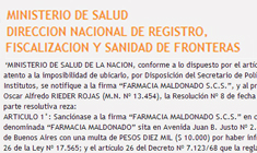 El Ministerio de Salud de la Nación a través de la Dirección Nacional de Registro, Fiscalización y Sanidad de Fronteras sancionó a la porteña farmacia Maldonado.