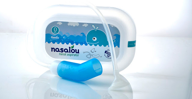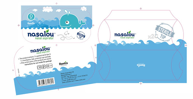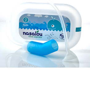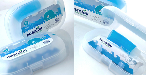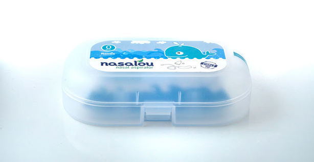 Se trata de Nasalou, un aspirador nasal pensado para bebés y niños que viene en una cajita plástica transparente con stickers a ambos lados y está personificado por una ballena.