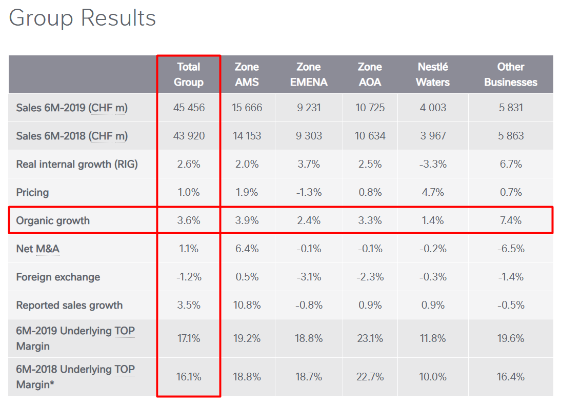 La suiza Nestlé publicó sus resultados financieros para esta primera parte del 2019, el viernes 26 de julio. La compañía informó que tuvo un crecimiento orgánico del 3.6% y registró ventas por 45.4 mil millones de francos suizos. Ver press release.