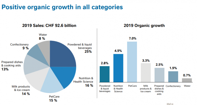 La suiza Nestlé terminó un 2019 en el que registró un crecimiento orgánico del 3.5% para el total del grupo, aunque las distintas unidades que posee la compañía mostraron una variada performance. El negocio de Cuidado de mascotas apalancó el aumento en las ventas y trepó un 7% según el reporte de resultados. Luego, el segmento de Nutrición y Health Science, con marcas como Nestum, Nan y Boost, llegó al 4.9%.