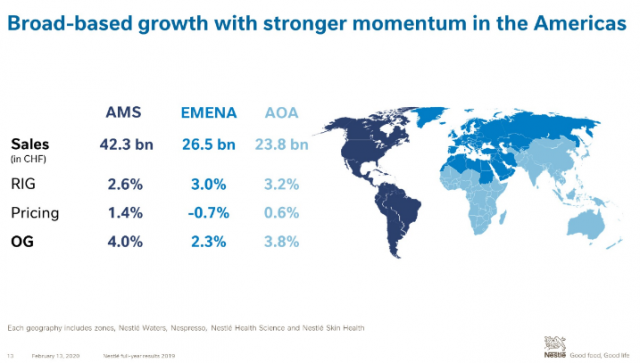 En su desempeño por regiones, durante el 2019 Nestlé mostró un mayor crecimiento en las Américas, con un 3.9% arriba en las ventas de la zona que representa el 45% de su facturación total. En América Latina, la firma destacó los buenos resultados que tuvo en Brasil y México. Debajo quedó Asia, Oceanía y África Sub-sahariana que trepó un 3.2% y que ya significa el 26% de sus ingresos. Por último, Europa, Oriente Medio y el Norte de África le dieron a la multi el 29% de las ventas y se elevaron un 2.7% frente al 2018.