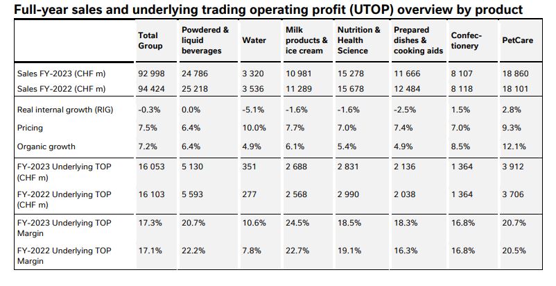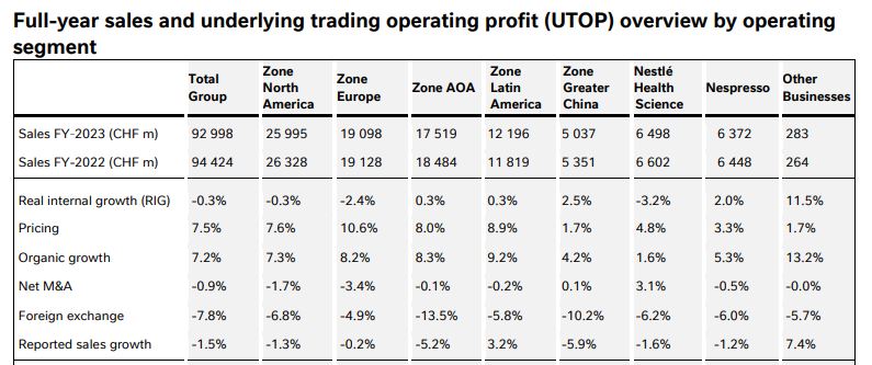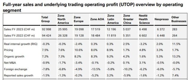 El gigante de consumo masivo Nestlé alcanzó ventas globales por CHF 92.998 millones (u$s 105.610 millones) a lo largo del 2023. Esto representa un incremento del 7,2% en términos orgánicos y una caída del -1,5% si se lo compara con los CHF 94.424 millones (u$s 107.230 millones) reportados en 2022. La compañía explicó que los tipos de cambios tuvieron un efecto negativo del -7,8% sobre los ingresos. Ver Press Release