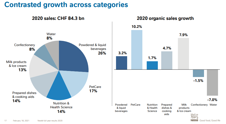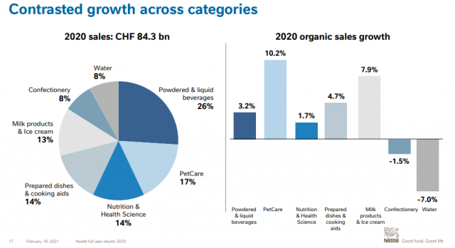 La suiza Nestlé terminó el 2020 con un incremento orgánico del 3.6% en sus ventas globales. El negocio de Nutrition & Health Science también exhibió cifras positivas, con una variación del 1.7%. En cambio, la cartera de Aguas se derrumbó en un -7%.