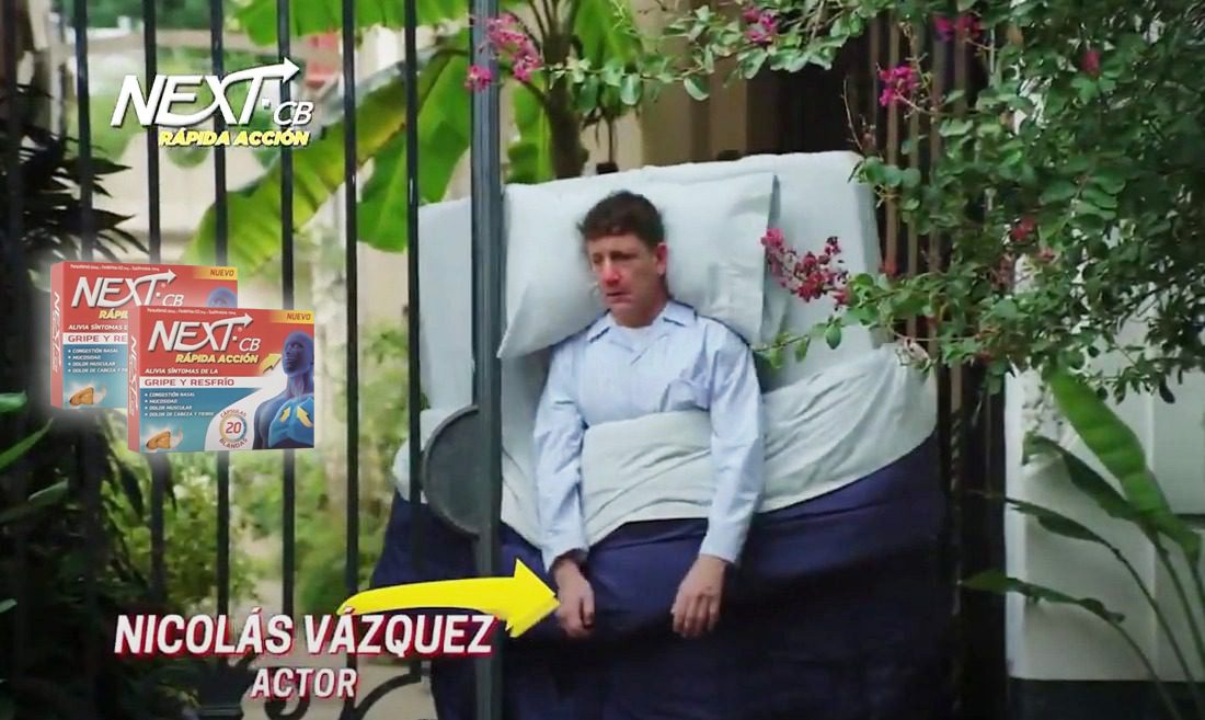 «¿Una vez más los síntomas de la gripe te tienen atrapado?», pregunta una voz en off mientras el actor Nico Vázquez camina por la calle con una cama que no lo deja salir. Así, los mexicanos de Genomma le ponen los flashes a su analgésico Next CB Rápida acción, en su presentación de cápsulas blandas.