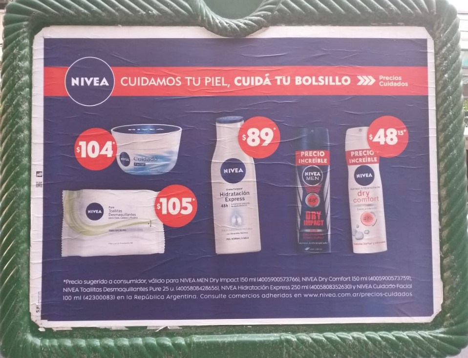 Bajo el claim «Cuidamos tu piel, cuidá tu bolsillo«, la multi seleccionó cinco de sus productos que forman parte de la nómina de Precios Cuidados y que responden a su marca Nivea. Son dos desodorantes; dos productos para el cuidado de la piel y una presentación de toallitas desmaquillantes. En su cartelería, la compañía le añadió a los ítems sus respectivos precios.