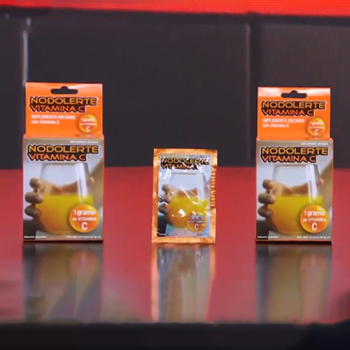 «Si querés tomar un gramo de vitamina C por día y no lo encontrás en las farmacias acordate de Nodolerte«, dice Fernández. Y la locutora remata afirmando que un gramo de vitamina C, equivale a 18 naranjas. Cada unidad cuesta $40 (u$s 0,43) y el pack de 10, $400 (u$s 4,32).