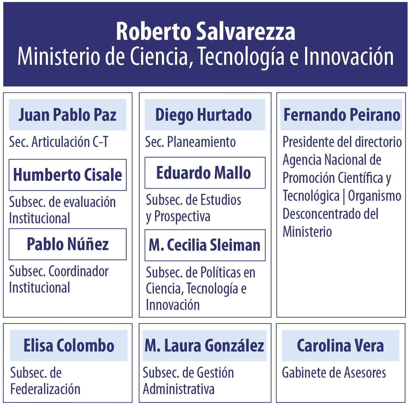 En el cargo de secretario de Articulación Científico-Tecnológica fue designado Juan Pablo Paz y como Secretario de Planeamiento y Políticas de Ciencia, Tecnología e Innovación se eligió a Diego Hurtado de Mendoza. Ver abajo.