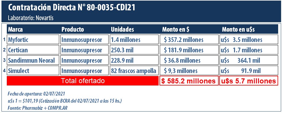 Una nueva compra pública de inmunosupresores tuvo su puntapié inicial en este julio del 2021. El Ministerio de Salud de la Nación abrió una contratación directa orientada a la adquisición de Myfortic; Certican; Sandimmun Neoral; y Simulect, todas marcas de la suiza Novartis.