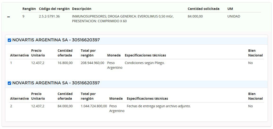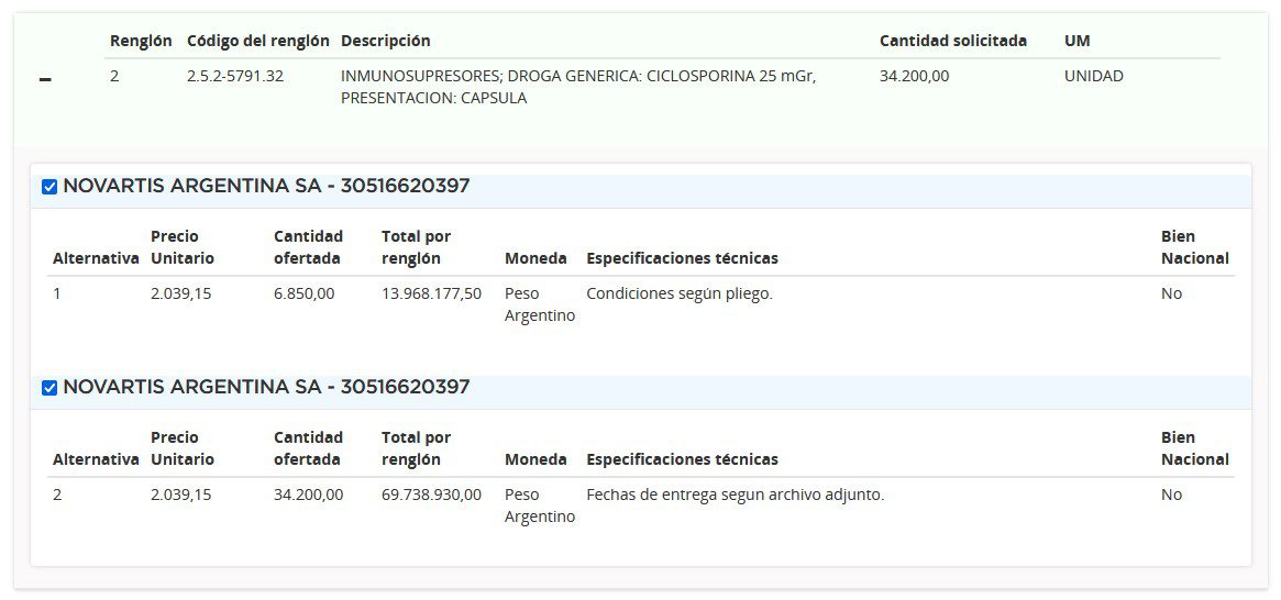 La compra, que fue solicitada para el Instituto Nacional Central Único Coordinador de Ablación e Implante, INCUCAI, consta de 11 renglones. La misma apunta específicamente a abastecerse de tres presentaciones de Sandimmun Neoral, a base de ciclosporina. Son 1.067 cajas por 60 comprimidos de 10mg.; 684 cajas por 50 comprimidos de 25mg.; 2.448 cajas de 50 pastillas de 50mg; y 1.800 frascos de su presentación bebible por 100mg. Ver Pliego