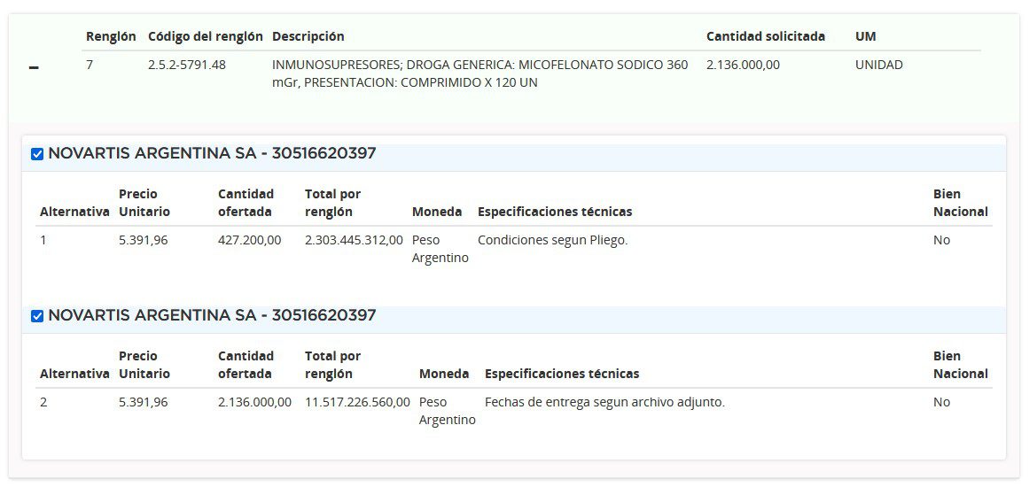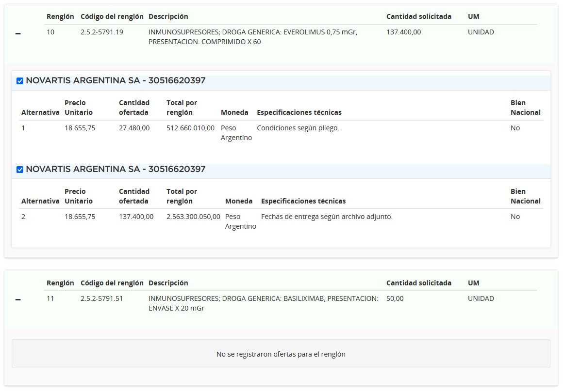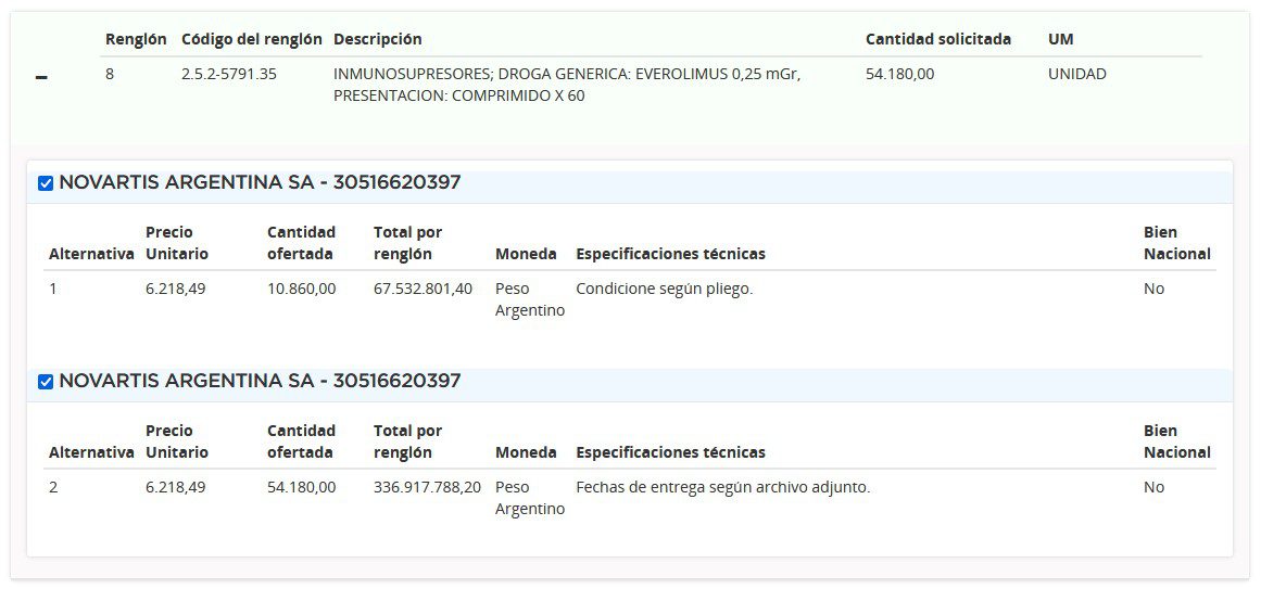 Sin embargo, durante el acto de apertura Novartis presentó dos ofertas en todos los renglones menos en el último, el cual quedó vacante. Según lo detalla la compañía, la multi puede comprometerse a entregar hasta un 20% de lo solicitado de cada producto en las fechas estipuladas en el pliego de bases y condiciones, por lo cual cotizarían $3.470 millones (u$s 3.2 millones). En paralelo, la empresa dijo que podría hacer entrega del total de los renglones en los que participa, aunque no en los tiempos requeridos por el Ministerio de Salud de la Nación. Por esto podría percibir ingresos de hasta $16.727 millones (u$s 15.6 millones). Ver Cuadro Comparativo