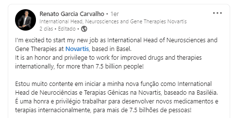 La multi designó a Renato Garcia Carvalho como head internacional de los negocios de Neurociencias y Terapias Génicas. Esta labor tendrá su asiento principal en la casa matriz, situada en Basilea.
