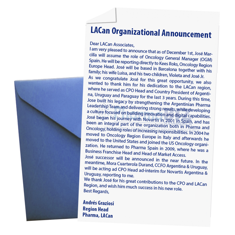 A partir del 1º de diciembre, el ejecutivo volverá a España para sentarse como cabeza de Novartis Oncología. Así quedará vacante el sillón principal de la filial local, en donde según consta en la carta oficial y que forma parte de este artículo, Marcilla será reemplazado de forma interina por Mora Cuarterola Durand, una argentina que actúa como CFO. Ver carta.