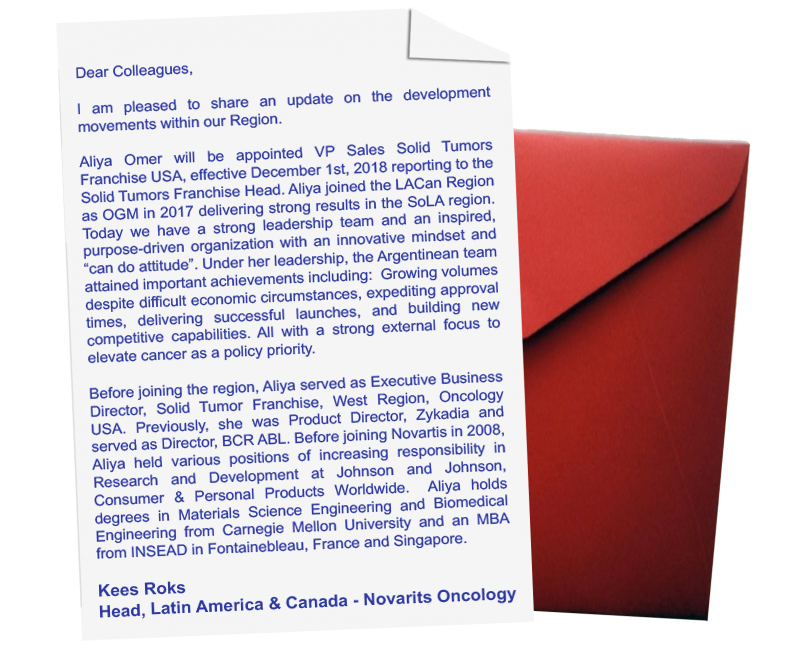 Novartis Oncology had placed Aliya Omer from the US to captain its southern sub-region, comprising Argentina, Uruguay, Paraguay and Bolivia for only a year and a bit. See article in Spanish.