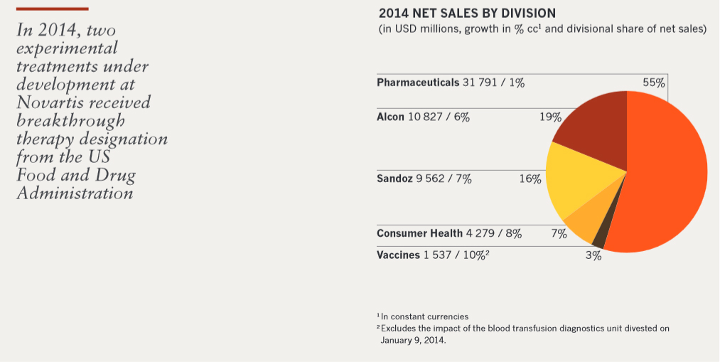 De acuerdo con las ventas netas por división, Farma fue el negocio que mejor anduvo para Novartis con un 55% de las ventas. En segundo lugar le siguió Alcon, alcanzado el 18% de participación. El tercer lugar en ventas fue para Sandoz con 16%.