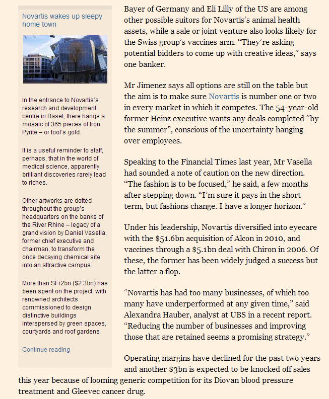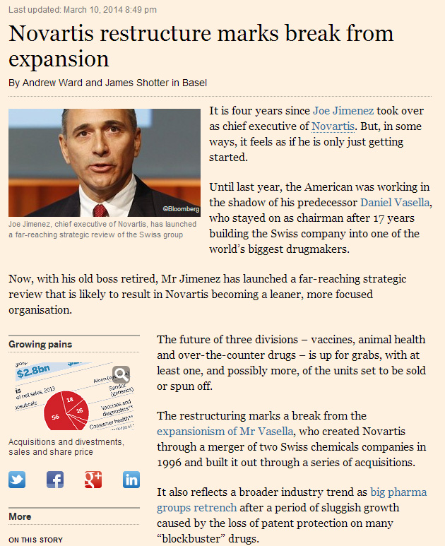 Esta reestructuración marcaría entonces un quiebre del expansionismo de Vasella, que creó a Novartis a partir de la fusión de dos compañías químicas suizas en 1996 y la construyó en base a una serie de adquisiciones.