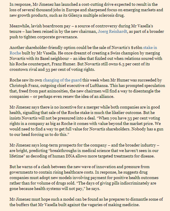 Según los periodistas Andrew Ward y James Shotter hasta el año pasado, el norteamericano trabajaba en las sombras de su predecesor Daniel Vasella, que siguió como presidente del directorio después de dedicarle 17 años a la compañía.