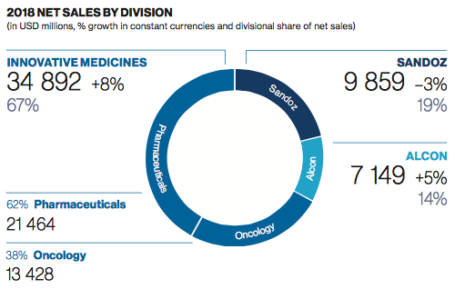 En paralelo, su empresa de genéricos Sandoz declinó su facturación en un -3%. Mientras que su división de cuidado ocular Alcon consignó una suba del 5% en comparación con el año anterior. La misma está ultimando los detalles para materializar su spin off en este 2019 y así ingresar a la bolsa como una compañía independiente, cuyas oficinas globales estarán ubicadas en el Cantón de Ginebra, en Suiza.