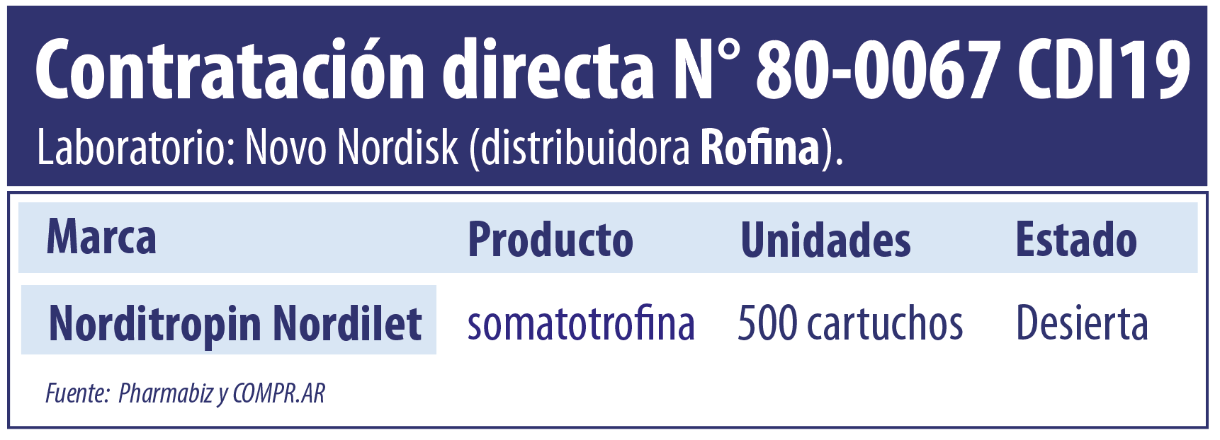 El Estado tenía en agenda una Contratación Directa por Exclusividad con el objetivo de adquirir la hormona de crecimiento Norditropin Nordilet de la danesa Novo Nordisk. Sin embargo, la compra fue desestimada, rotulándose como «desierta».