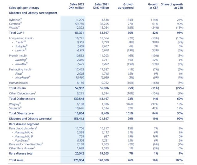 Por su parte, la contribución de la unidad de Insulinas volvió a caer, con ventas de DKK 48.022 (u$s 6.974 millones), -9.3% por debajo de su total en 2022. Por último, el negocio de Enfermedades Raras, que incluye productos para trastornos sanguíneos y endocrinos raros, declinó un -16% a un total de DKK 17.163 millones (u$s 2.493 millones). Ver presentación