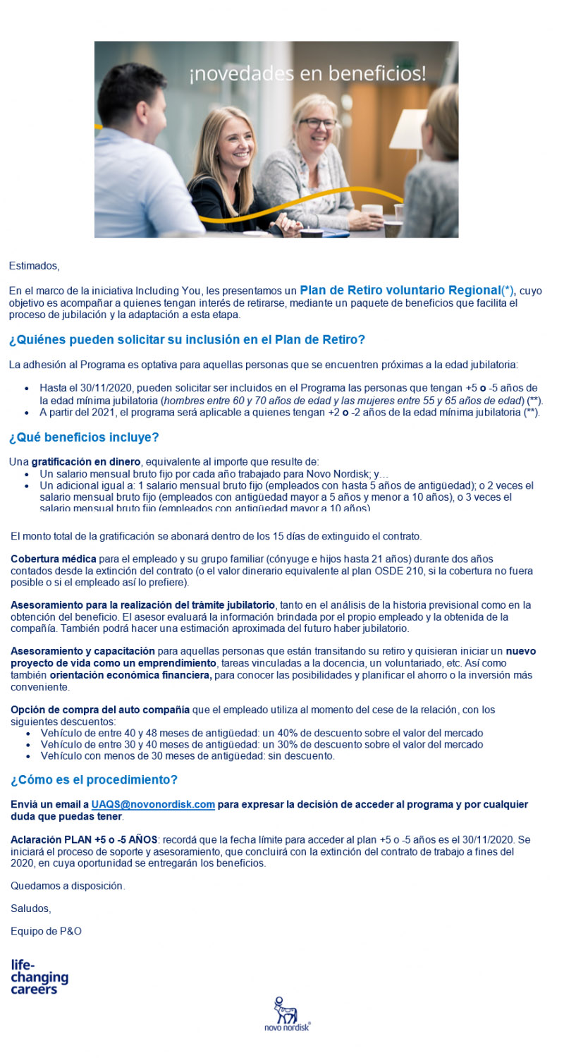 La que acaba de optar por esta opción es la danesa Novo Nordisk, que lanzó lo que dio en llamar un «plan de retiro». El mismo está orientado a los empleados que estén a +5 o -5 años de jubilarse. El rango para los hombres es de entre 60 y 70 años de edad y para las mujeres la franja abarca entre los 55 y los 60 años.