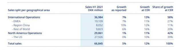 En abril de 2020, la danesa reorganizó la distribución geográfica de sus Operaciones Internacionales en tres regiones: EMEA, que agrupa a Europa, Medio Oriente y Africa; China, que comprende también a Hong Kong y Taiwán; y Resto del Mundo, que cubre todos los otros países excepto América del Norte.