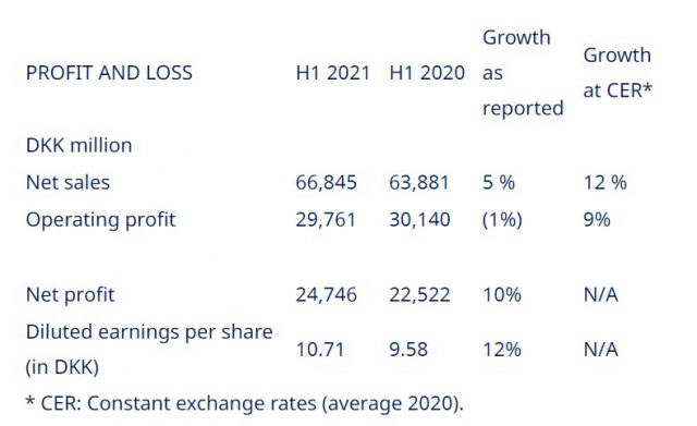 La danesa Novo Nordisk presentó sus estados contables correspondientes a la primera mitad del 2021. En este período sus ventas crecieron un 12% en moneda constante a 66.845 millones de coronas danesas (u$s 10.678,1 millones). Ver Press Release