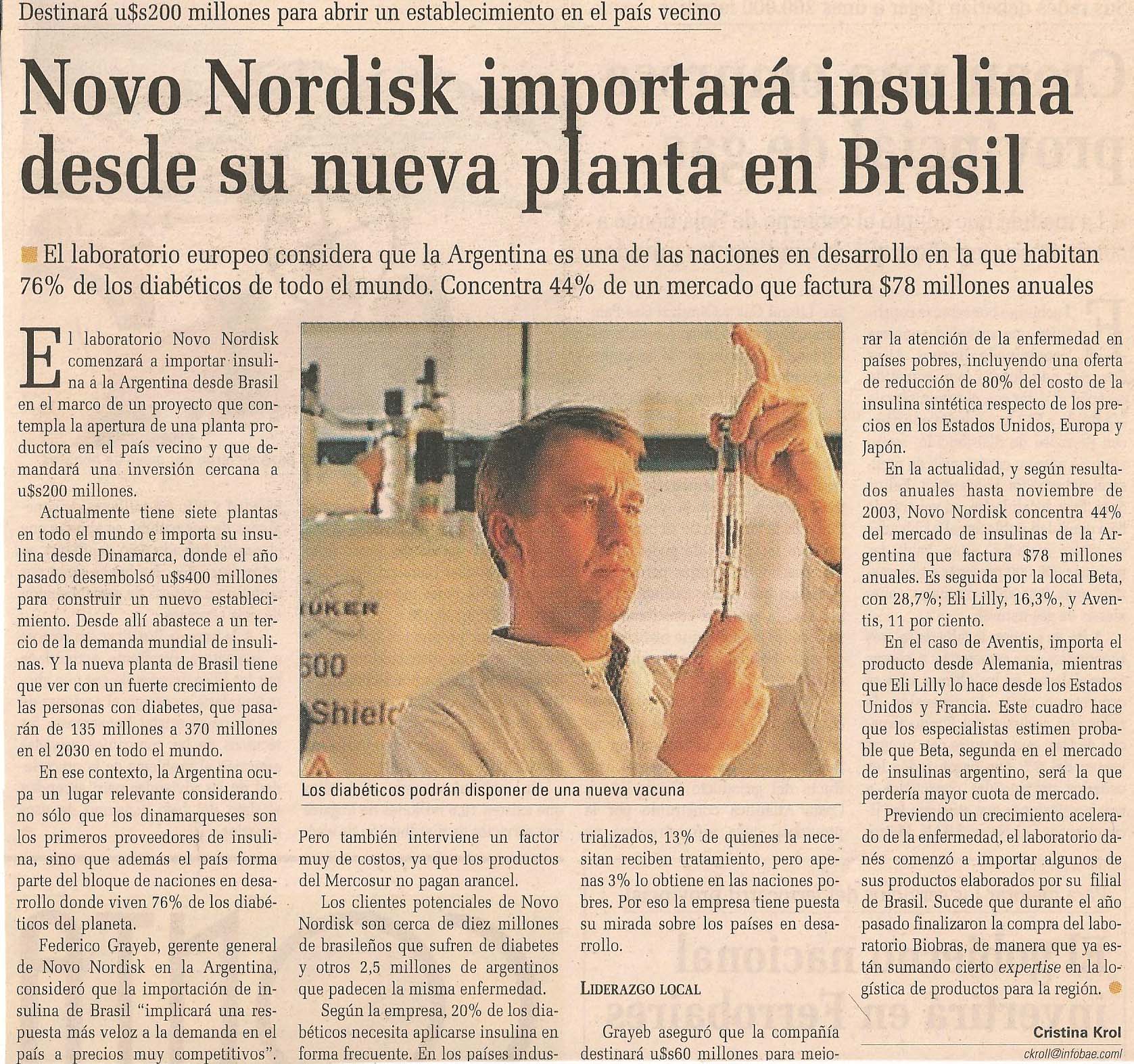 En la actualidad, y según resultados anuales hasta noviembre de 2003, Novo Nordisk concentra 44% del mercado de insulinas de la Argentina que factura $78 millones anuales. Es seguida por la local Beta, con 28,7%; Eli Lilly, 16,3%, y Aventis, 11 por ciento.