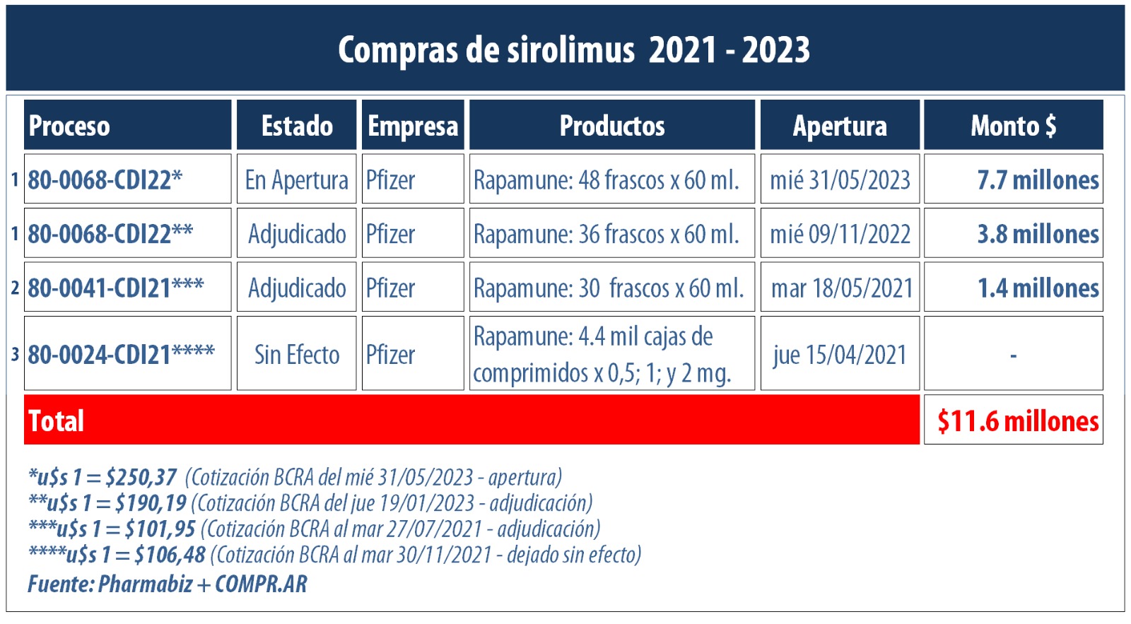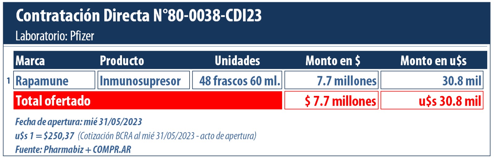 El proceso apunta específicamente a la compra de 48 frascos de 60 ml. cada uno, a base de sirolimus 1mg. Durante el acto de apertura de la contratación, la multi cotizó una suma de $7.7 millones (u$s 30.8 mil) a fin de proveerle al Estado el total solicitado de su producto de industria canadiense. Ver Cuadro Comparativo.
