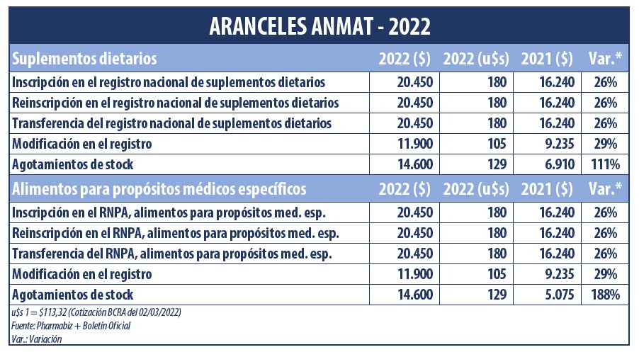 En el caso de las modificaciones en el registro el importe es de $11.900 (u$s 105) en este 2022, cuando en el 2021 representaba una erogación de $9.235 (u$s 100*). Otro de los aranceles que lista la ANMAT para este segmento es el relativo al agotamiento de stock, que pasó a costar $14.600 (u$s 129), lo que se traduce en una suba del 111%. Ver listado.