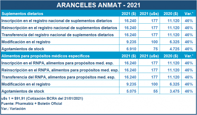 La ANMAT actualizó más rubros de su tarifario 2021. Hoy se conocieron los fees que deben abonar las empresas para realizar trámites ante la agencia regulatoria local relativos al segmento de los suplementos dietarios. Ver disposición 705/21.
