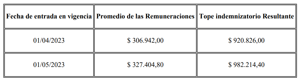 El promedio de las remuneraciones que responde al acuerdo salarial validado por la Federación Argentina de Agentes de Propaganda Medica y la Asociación Agentes de Propaganda Medica de la República Argentina y las cámaras empresarias CILFA; CAEMe y COOPERALA para mayo de este 2023 fue fijado en $327.404,80 (u$s 892,79). En función a ello, desde el primer día del quinto mes el tope indemnizatorio resultante fue establecido en $982.214,4 (u$s 2.678,38).