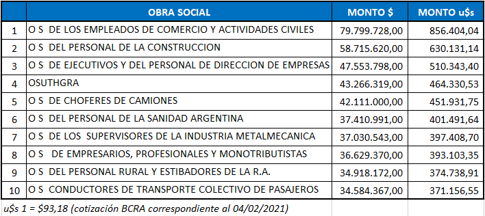 Las dos obras sociales que mas fondos percibirán vuelven a ser las mismas que en diciembre. La primera del listado es la Obra Social de los Empleados de Comercio a la que le ingresarán $79,7 millones (u$s 856,4 mil).
