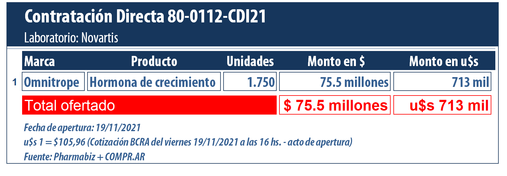 El Ministerio de Salud de la Nación reflotó una contratación directa por exclusividad que había caratulado como «desierta» dos meses consecutivos -en septiembre y en octubre- y que apunta a la adquisición de una hormona de crecimiento a la suiza Novartis. Ver Contratación.