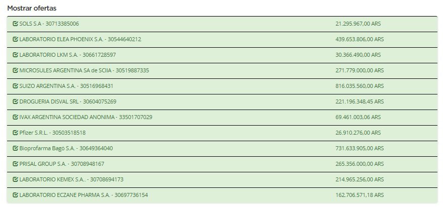 Otra que se inscribió en cuatro renglones fue la israelí Teva, que pide en total $69.5 M (u$s 69.5 mil). Y el gran dato en este caso es que en tres de los mismos surge como la única oferente. Y la droguería Suizo Argentina, que cotizó $816 M (u$s 816.8 mil), también puso la firma en cuatro renglones. De estos, se constituye como única oferente en el renglón 37.