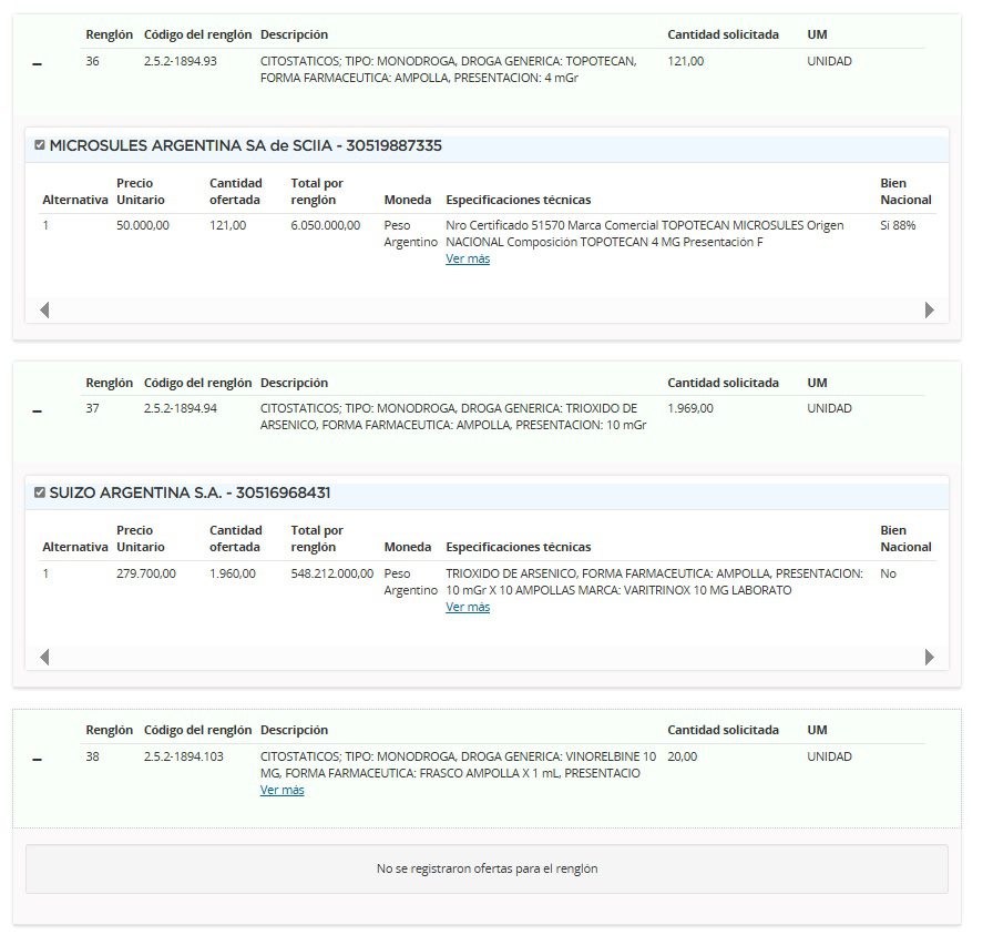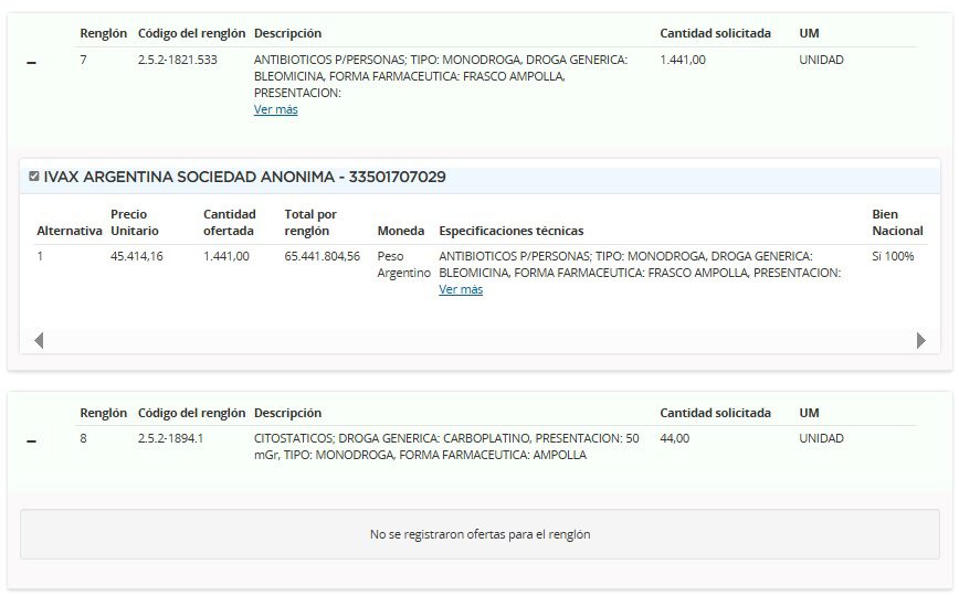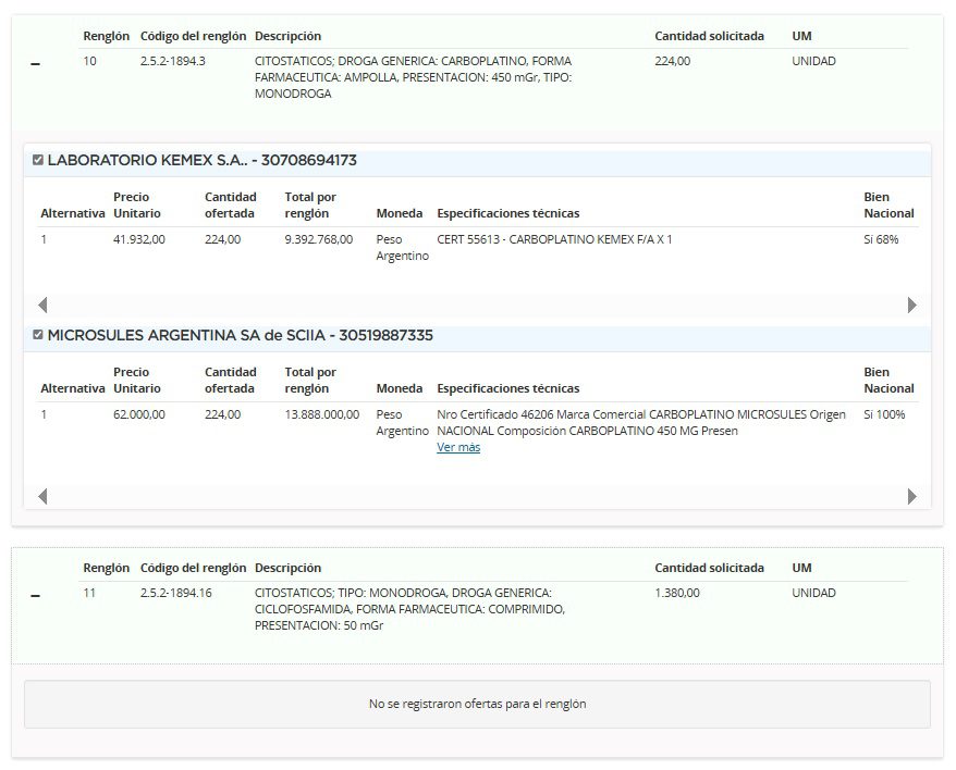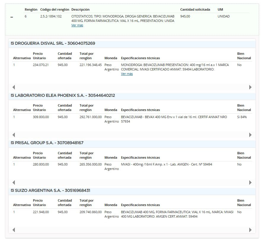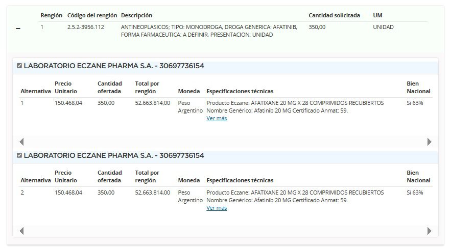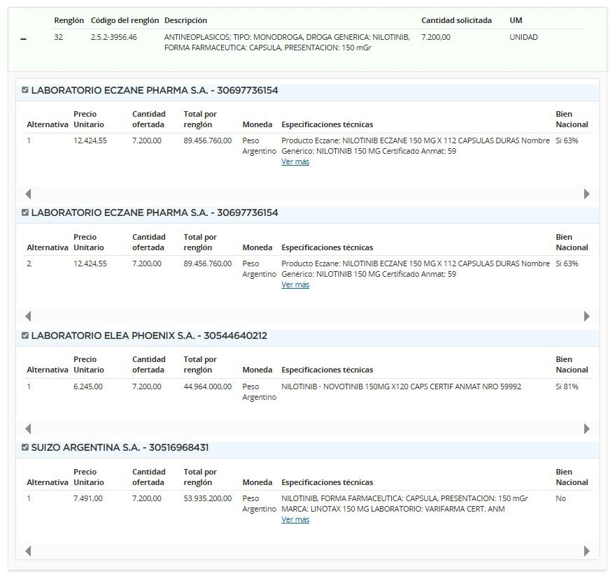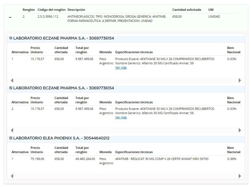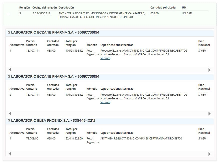 Tanto los nacionales de Elea, con un total de $439.7 M (u$s 440.1 mil), como los de Eczane, con $162.7 M (u$s 162.9 mil), apuntan a cubrir cuatro renglones, y ambos compiten en los renglones 2, 3, y 32. En los dos primeros, Eczane presentó los precios unitarios más bajos por amplia diferencia, mientras que en el último Elea es quien muestra la oferta más conveniente. Por su parte, Eczane resulta la única oferente en el renglón 1.