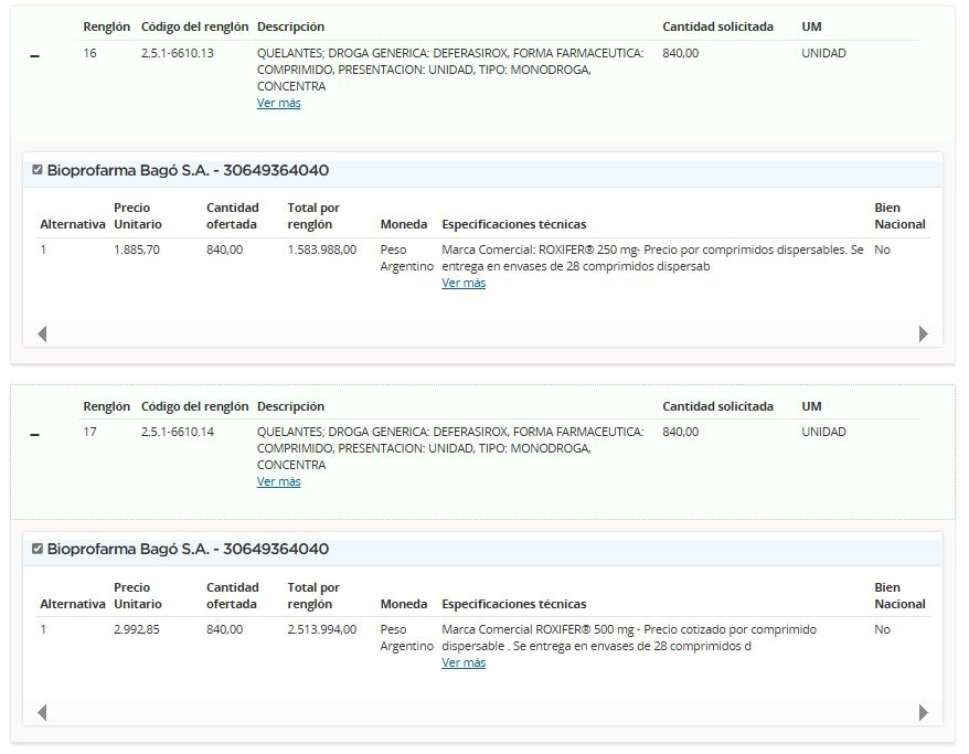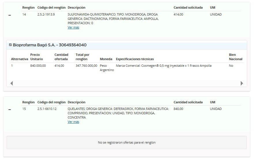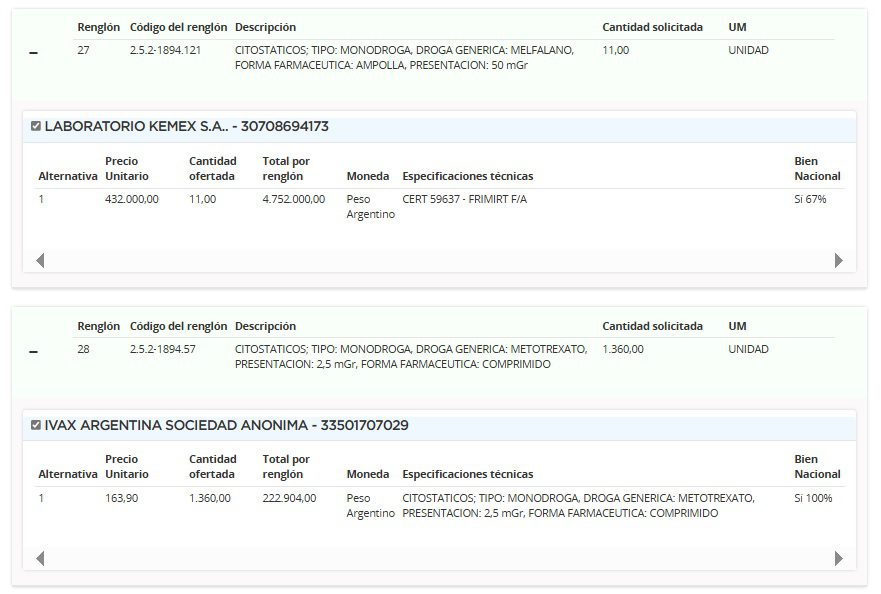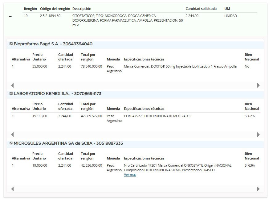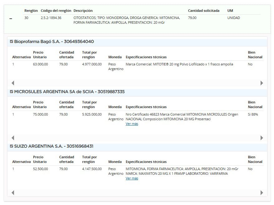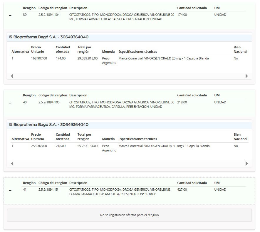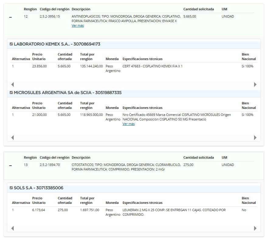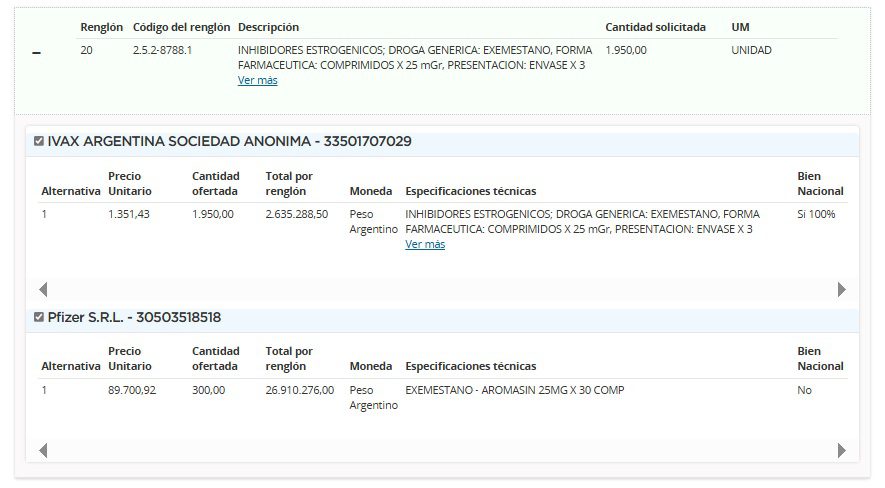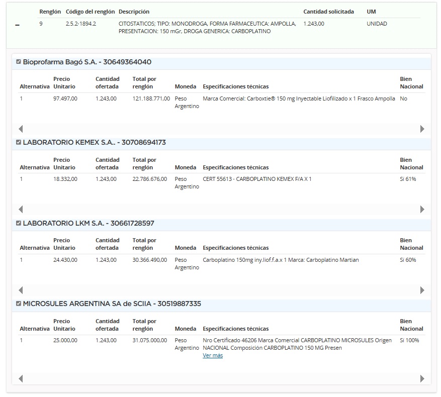 Tanto los nacionales de Elea, con un total de $439.7 M (u$s 440.1 mil), como los de Eczane, con $162.7 M (u$s 162.9 mil), apuntan a cubrir cuatro renglones, y ambos compiten en los renglones 2, 3, y 32. En los dos primeros, Eczane presentó los precios unitarios más bajos por amplia diferencia, mientras que en el último Elea es quien muestra la oferta más conveniente. Por su parte, Eczane resulta la única oferente en el renglón 1.