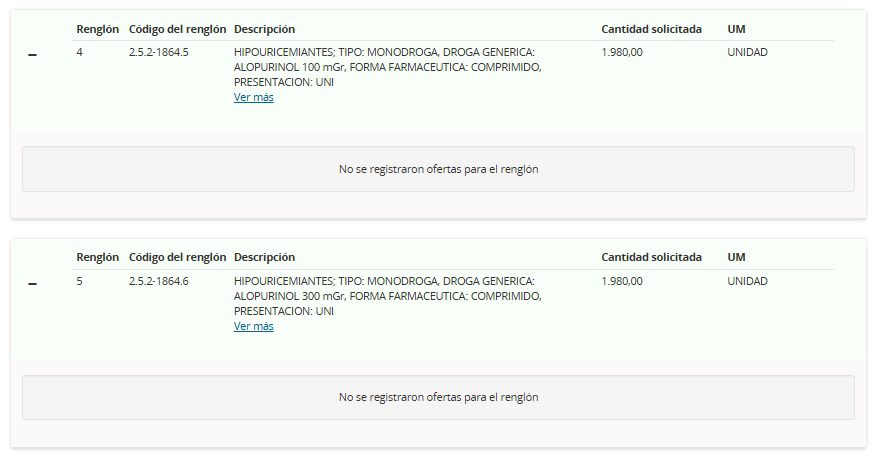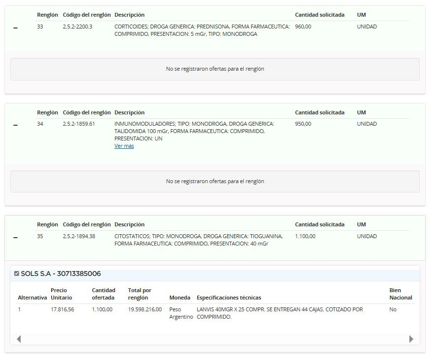 La droguería Sols, en tanto, dijo presente en los renglones 13 y 15, en ambos casos como opción única, por los que podría recibir $21.3 M (u$s 21.3 mil). Luego figuran las empresas que se anotaron en un solo renglón: Prisal Group y la droguería Disval, que compiten en el renglón 6 y cotizaron $265.4 M (u$s 265.6 mil) y $221.2 M (u$s 221.4 mil) respectivamente; Biotoscana, que se anotó junto a otros tres en el renglón 9 por $30.4 M (u$s 30.4 mil); y la norteamericana Pfizer, segunda oferente del renglón 20, por el que pide $26.9 M (u$s 26.9 mil). Por otro lado, 14 renglones de este proceso resultaron desiertos, al no haber recibido ofertas de ninguna índole.