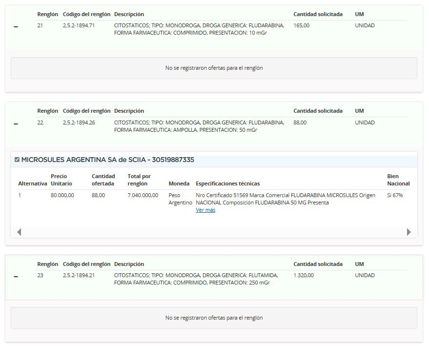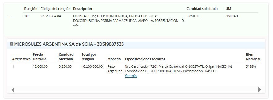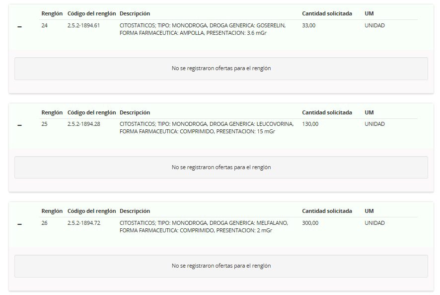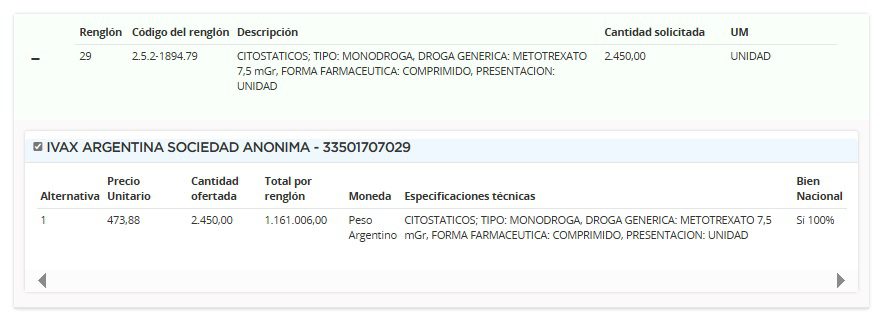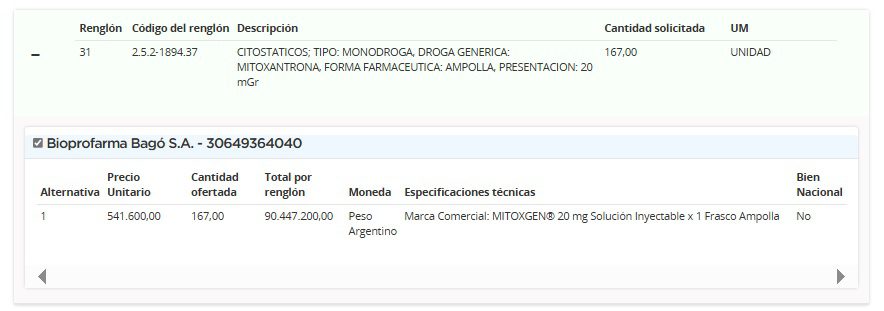 El proceso fue solicitado por la Dirección Nacional de Medicamentos y Tecnología Sanitaria, y la Dirección Nacional de Asistencia Directa Compensatoria. Según se informa, dicha adquisición se fundamenta en la idea de facilitar el acceso a los medicamentos por parte de personas sin recursos y con cobertura pública exclusiva, que cursan algún tipo de neoplasia. En total, el Estado cuenta con un presupuesto de $4.238 M (u$s 4.2 M), para una licitación conformada por 41 renglones. Ver Pliego