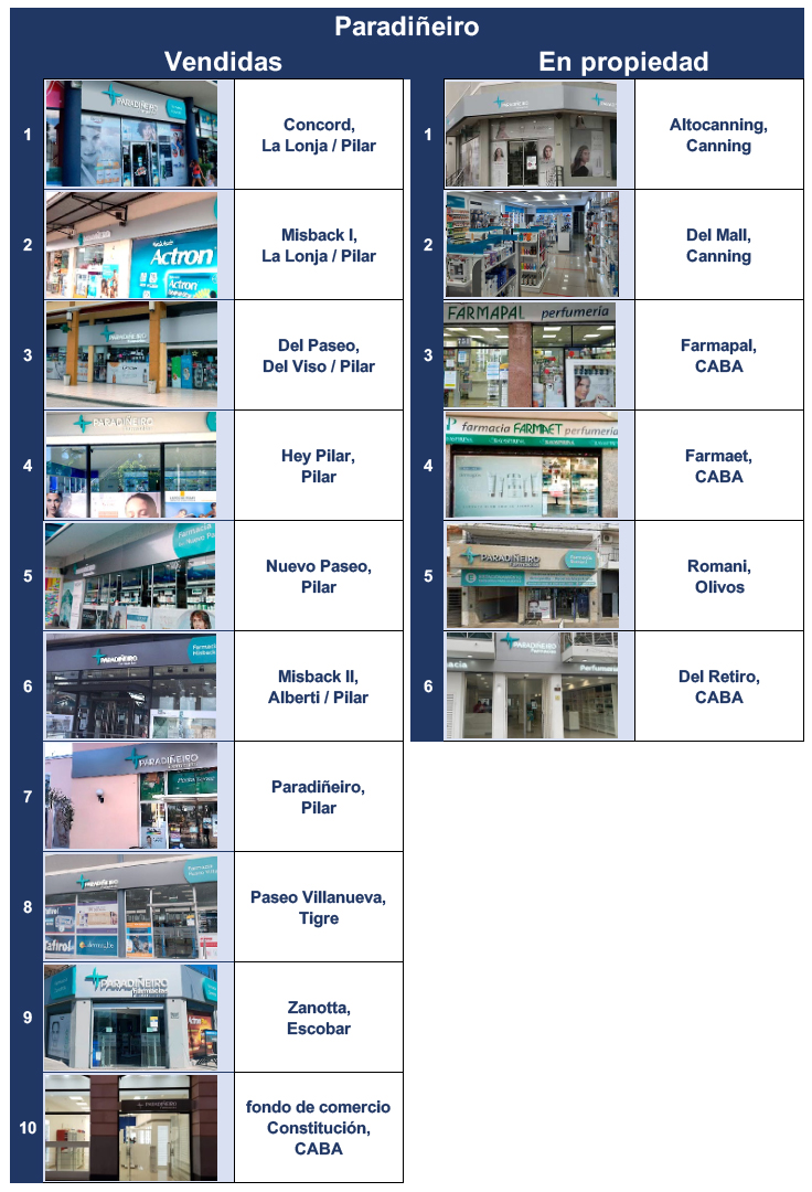 Por su parte, los ex accionistas de Paradiñeiro mantendrán algunos de los locales de la cadena que tomó forma hace 28 años. Por caso, el propio Hugo Paradiñeiro y otros accionistas se quedan con los dos situados en Canning, cercanos a las zonas de countries, y con las farmacias Farmapal, Farmaet y Del Retiro, todas localizadas en CABA. En tanto, la tríada conformada por los hermanos Sergio y Alejandro Misback y por Diego Marsans, se queda con la farmacia Romani. En paralelo, Laura Zanotta se concentrará en el e-commerce, el que migrará de nombre. Ver Paradiñeiro en Canning