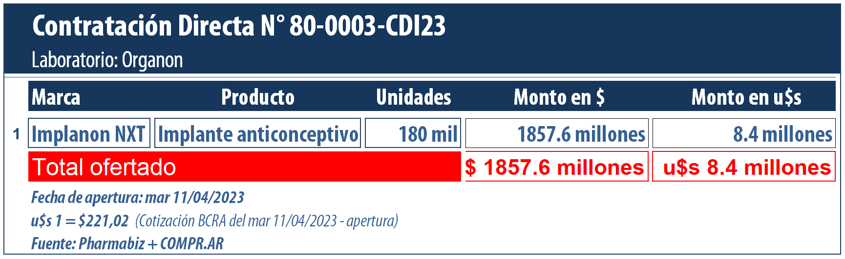 La multi presentó su oferta a efectos de participar en este proceso por 180 mil unidades de su anticonceptivo Implanon NXT. En caso de que el Estado le dé el visto bueno a la propuesta, Organon percibiría la suma de $1857.6 millones (u$s 8.4 millones). Ver Cuadro Comparativo.