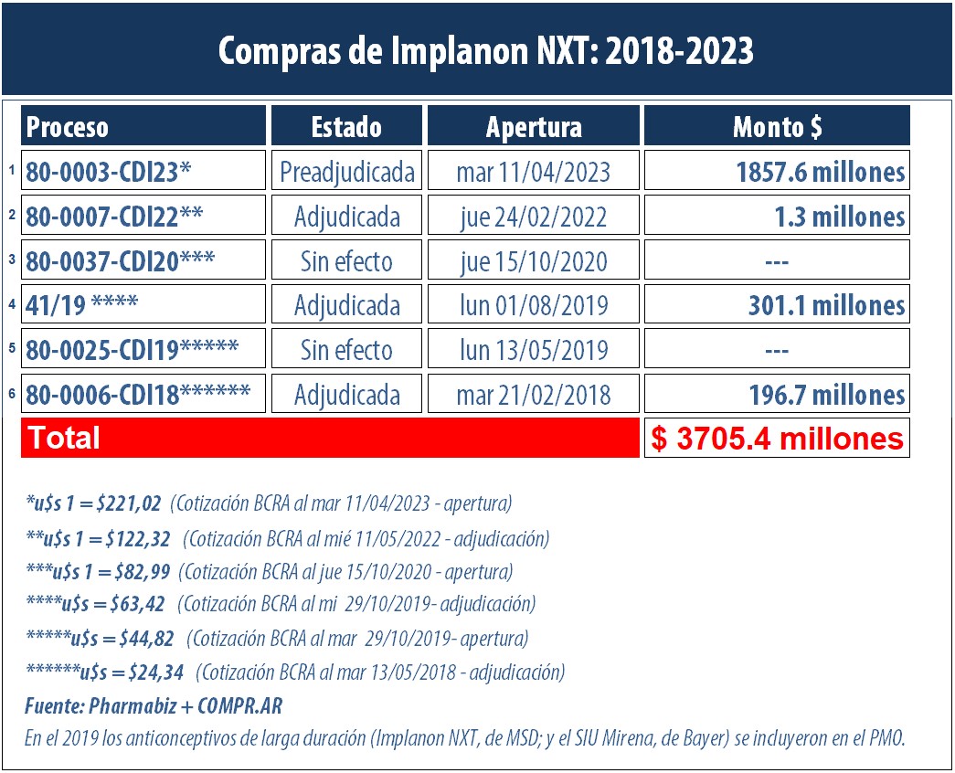 El Estado abrió hoy una nueva contratación directa por exclusividad. La misma es para adquirir 180 mil unidades del Implanon NXT de la norteamericana Organon. La empresa podría obtener ingresos de $1857.6 millones (u$s 8.4 millones).