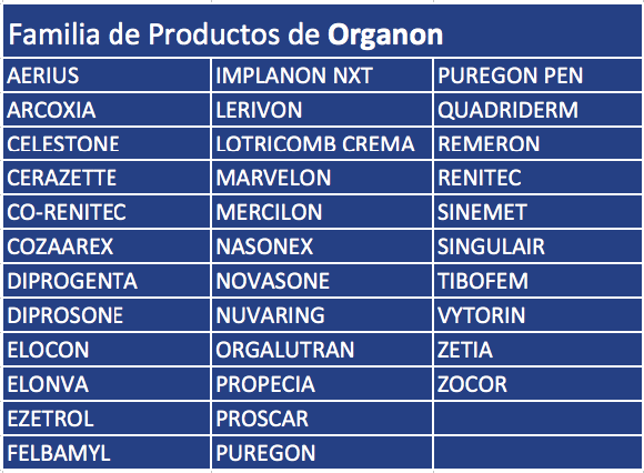 El portafolio de Organon se apoya principalmente en líneas anticonceptivas tales como el implante Implanon NXT; el anillo vaginal Nuvaring; y el oral Cerazette. También resaltan los inyectables Elonva y Puregon, ambos para estimulación ovárica. Además, se listan marcas maduras como el analgésico Arcoxia; el antiinflamatorio Celestone; el antihipertensivo Cozaarex; la crema Diprogenta; el reductor de lípidos Vytorin; y el antiasmático Singulair, entre otros.